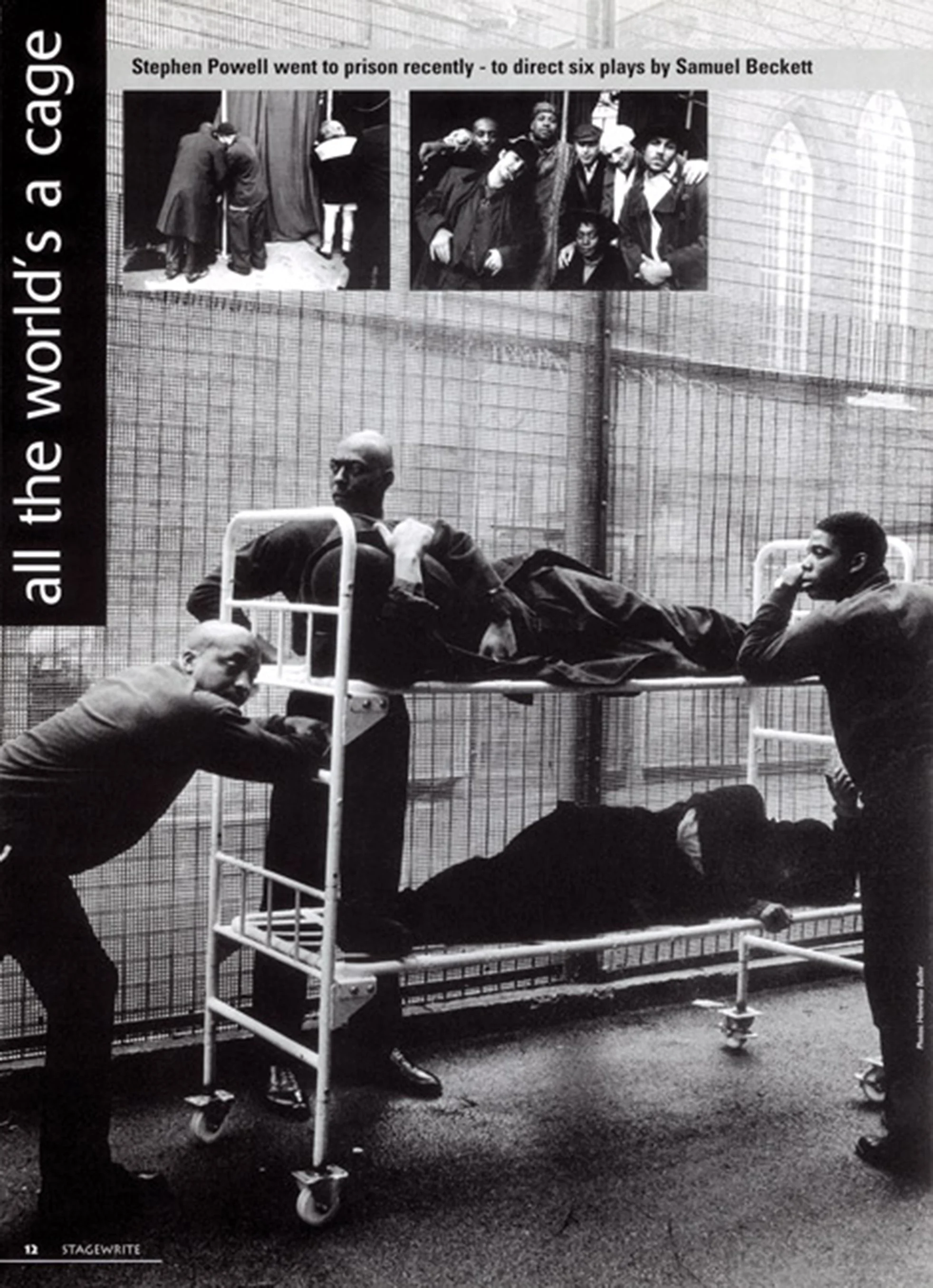 In September 1999, the National Theatre went into HMP Brixton to create a drama project in collaboration with some of the prisoners. NT Director Stephen Powell selected extracts from Samuel Beckett plays, and four National Theatre actors and two NT technicians worked alongside sixteen Brixton inmates. The repertoire was performed to the public over one week in the Cage—an acre-sized cage constructed for IRA inmates to exercise in, which they used until one day a helicopter freed several of them. The Cage too became a space of joy and renewal, transformed from its cold history